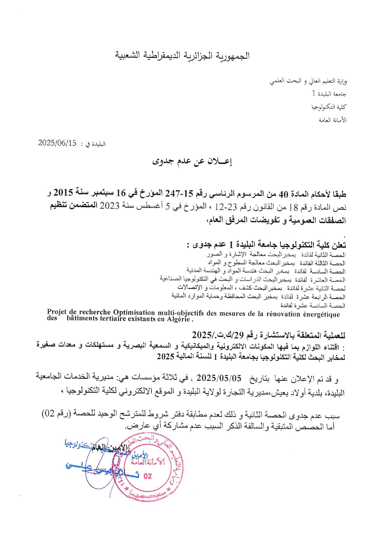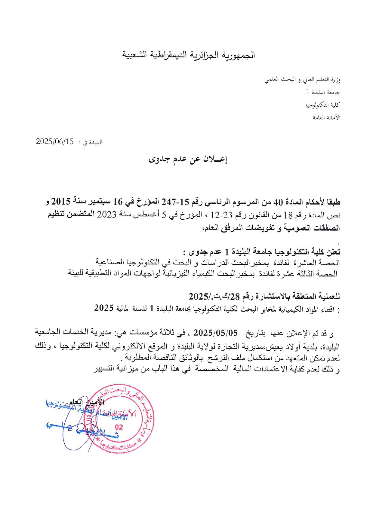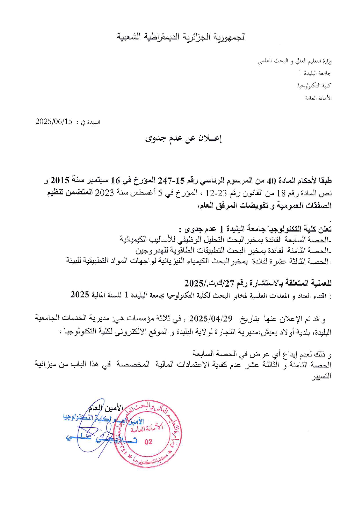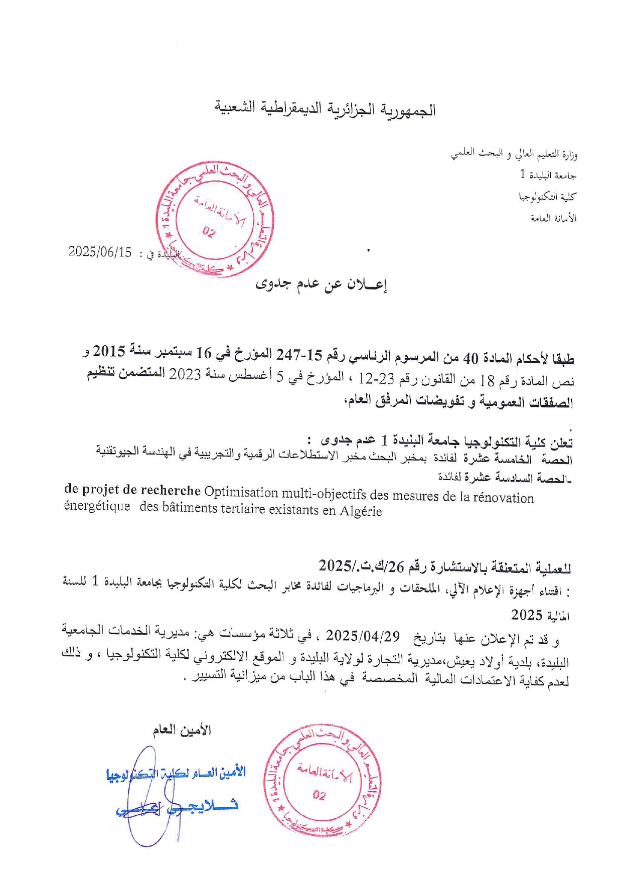 الاعلان عن عدم جدوى استشارة