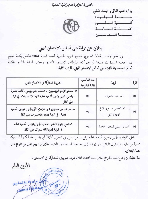 إعلان عن ترقية على أساس الإمتحان المهني