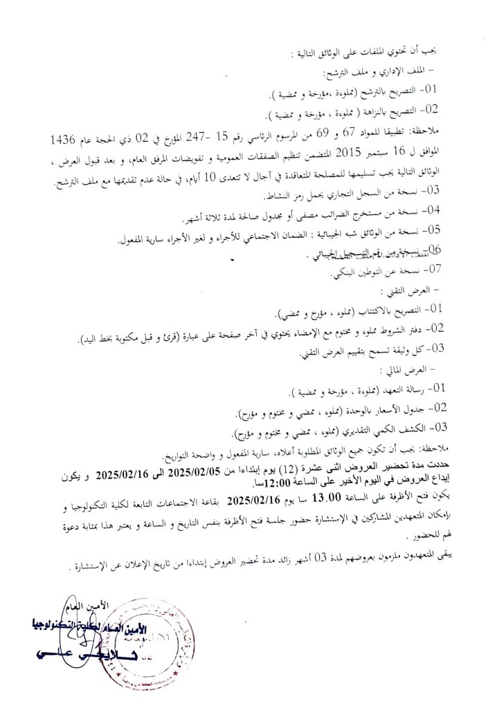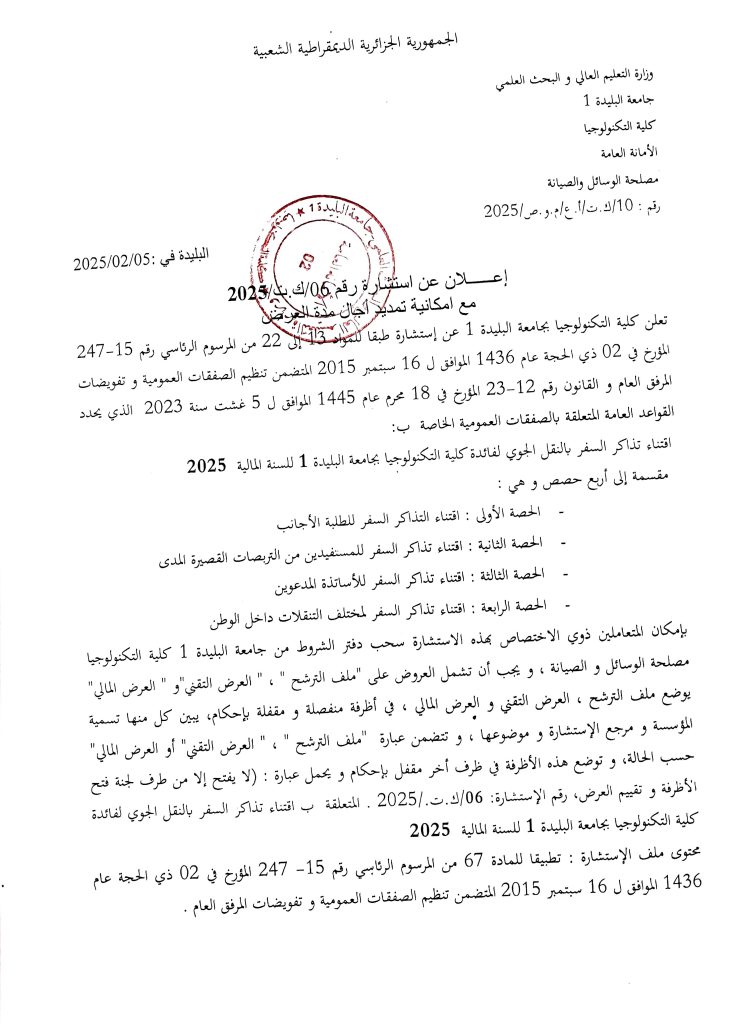 اعلان عن إستشارة رقم 06/ك.ت/2025 مع امكانية تمديد اجال مدة العرض