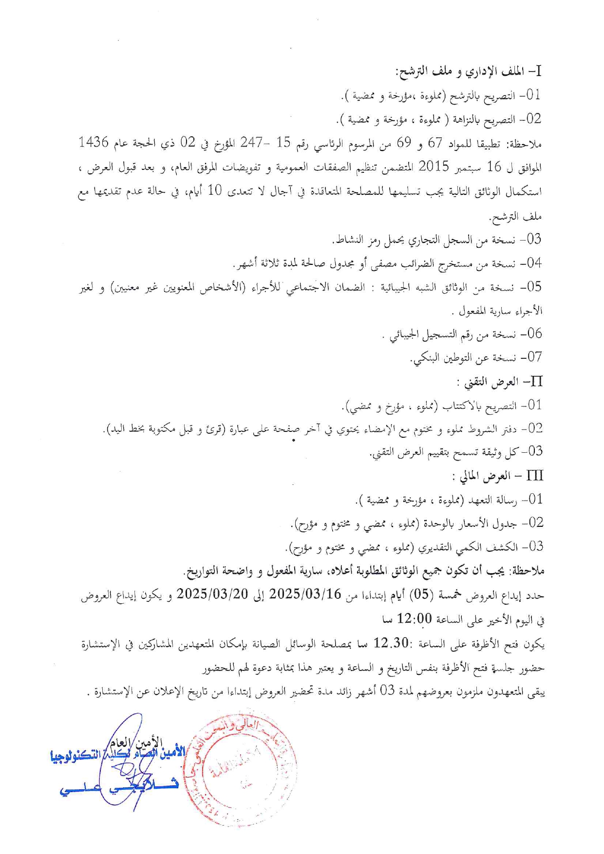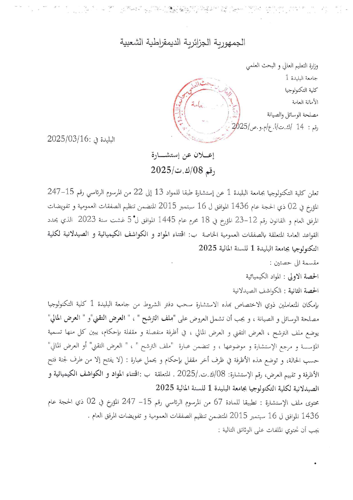 اعلان عن استشارة رقم 08: اقتناء المواد و الكواشف الكيميائية و الصيدلانية لكلية التكنولوجيا بجامعة البليدة 1للسنة المالية 2025