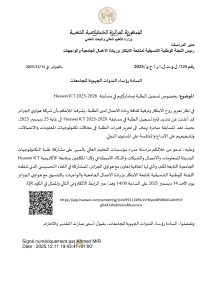 تبعا لمراسلة السيد رئيس اللجنة الوطنية التنسيقية لمتابعة الابتكار وريادة الأعمال الجامعية، وفي إطار تعزيز روح الابتكار وترقية ثقافة ريادة الأعمال لدى الطلبة، يشرفنا إعلامكم بأن شركة هواوي الجزائر قد أعلنت عن تمديد فترة تسجيل الطلبة في مسابقة Huawei ICT Competition 2025-2026 إلى غاية 25 ديسمبر 2025.