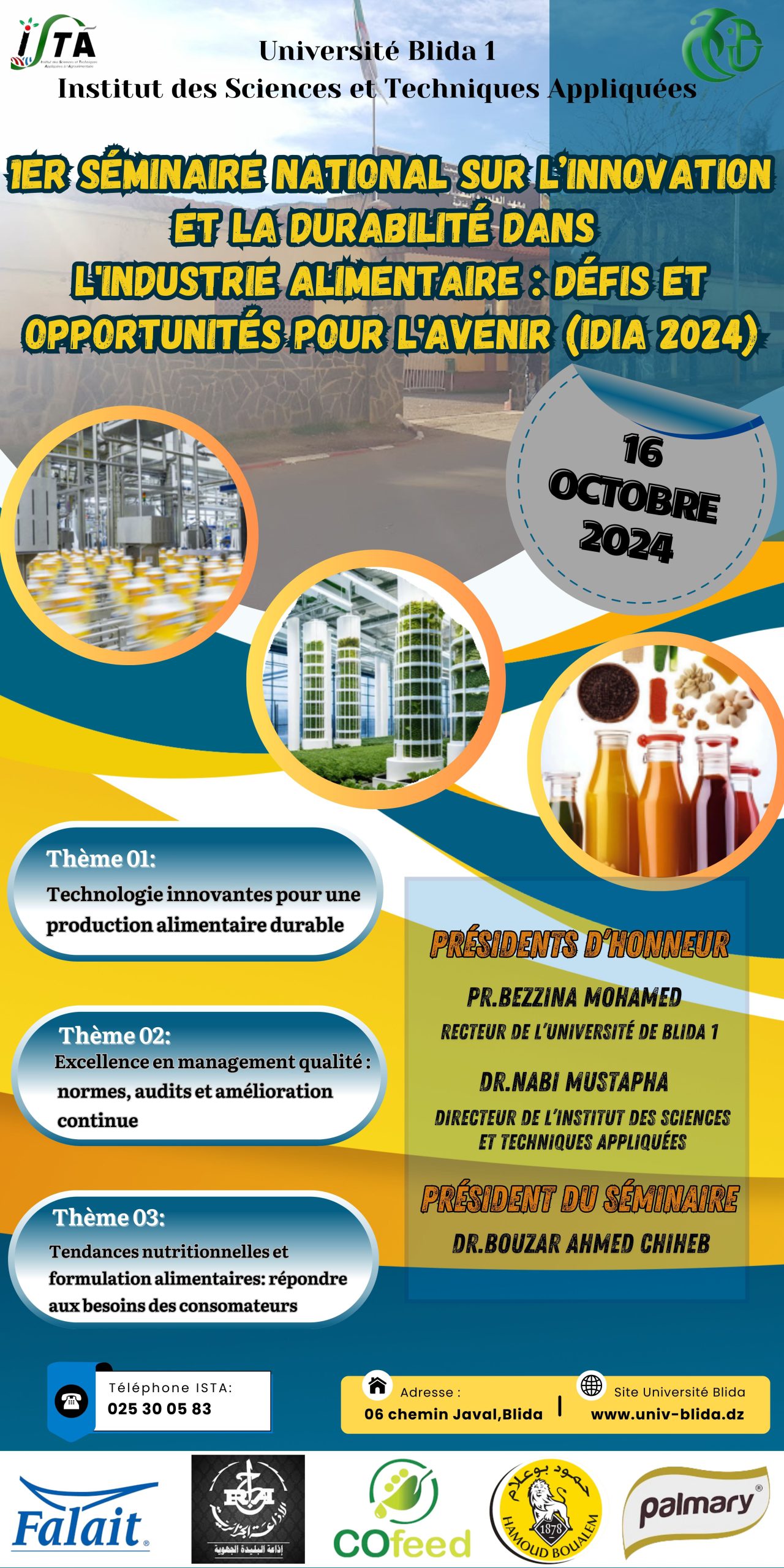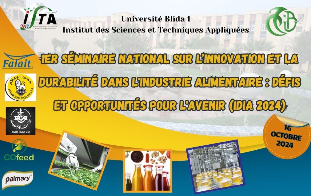 Le 16 octobre 2024, l’Institut des Sciences et Techniques Appliquées (ISTA) a accueilli la première édition du Séminaire National sur l’Innovation et la Durabilité dans l’Industrie Alimentaire (IDIA 2024). Cet événement d’envergure nationale, initié pour répondre aux défis grandissants de durabilité et d’innovation dans le secteur alimentaire, a été officiellement inauguré par M. Mustapha Nabi, Directeur de l’ISTA, et par M. Ahmed Bouzar, Président du séminaire.