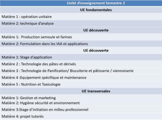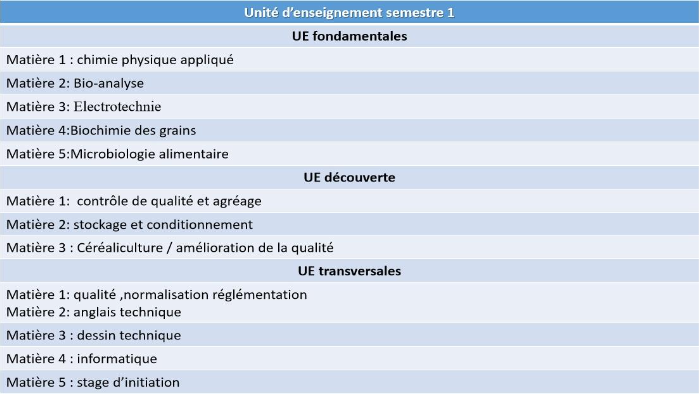 La formation vise à mettre sur le marché de l’emploi des cadres qualifiés et opérationnels au niveau des unités de transformations primaire et secondaire, des organismes stockeurs et de recherche développement. Elle permettra l’acquisition de notions suffisantes pour intervenir sur le produit (contrôle de qualité et suivi de l’analyse en laboratoire (analyses microbiologie, analyses physico-chimiques et technologiques des céréales et dérivés, agréage). Cette formation permettra aussi à l’étudiant d’acquérir des connaissances en économie – gestion pour intervenir dans l’axe technico-commercial et être apte à intervenir dans l’amélioration ou la mise au point des produits (Management de la qualité et de la sécurité alimentaire)