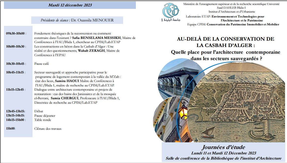 Cette journée qui a été fructueuse par une thématique très intéressante:” Au-delà de la conservation de la Casbah d’Alger: quelle place pour l’architecture contemporaine dans les secteurs sauvegardés?”, été initiée et sous la responsabilité scientifique de Pr.Chergui Samia et Dr. Menouer Ouassila, au niveau de la salle de conférences de la bibliothèque de l’IAU.