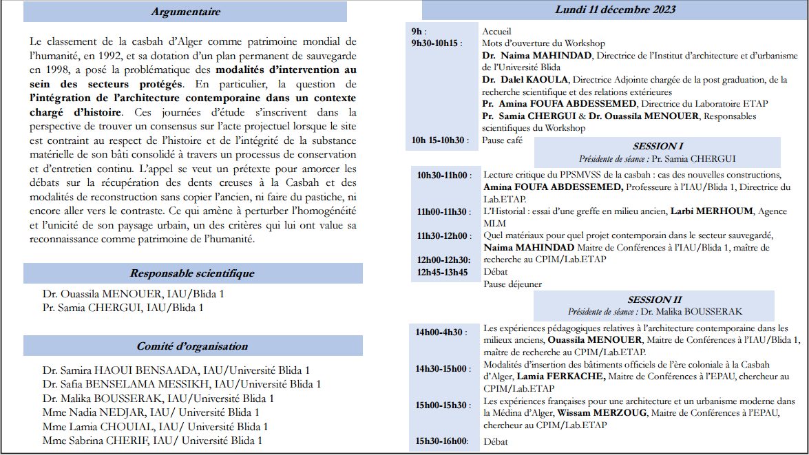 Cette journée qui a été fructueuse par une thématique très intéressante:” Au-delà de la conservation de la Casbah d’Alger: quelle place pour l’architecture contemporaine dans les secteurs sauvegardés?”, été initiée et sous la responsabilité scientifique de Pr.Chergui Samia et Dr. Menouer Ouassila, au niveau de la salle de conférences de la bibliothèque de l’IAU.
