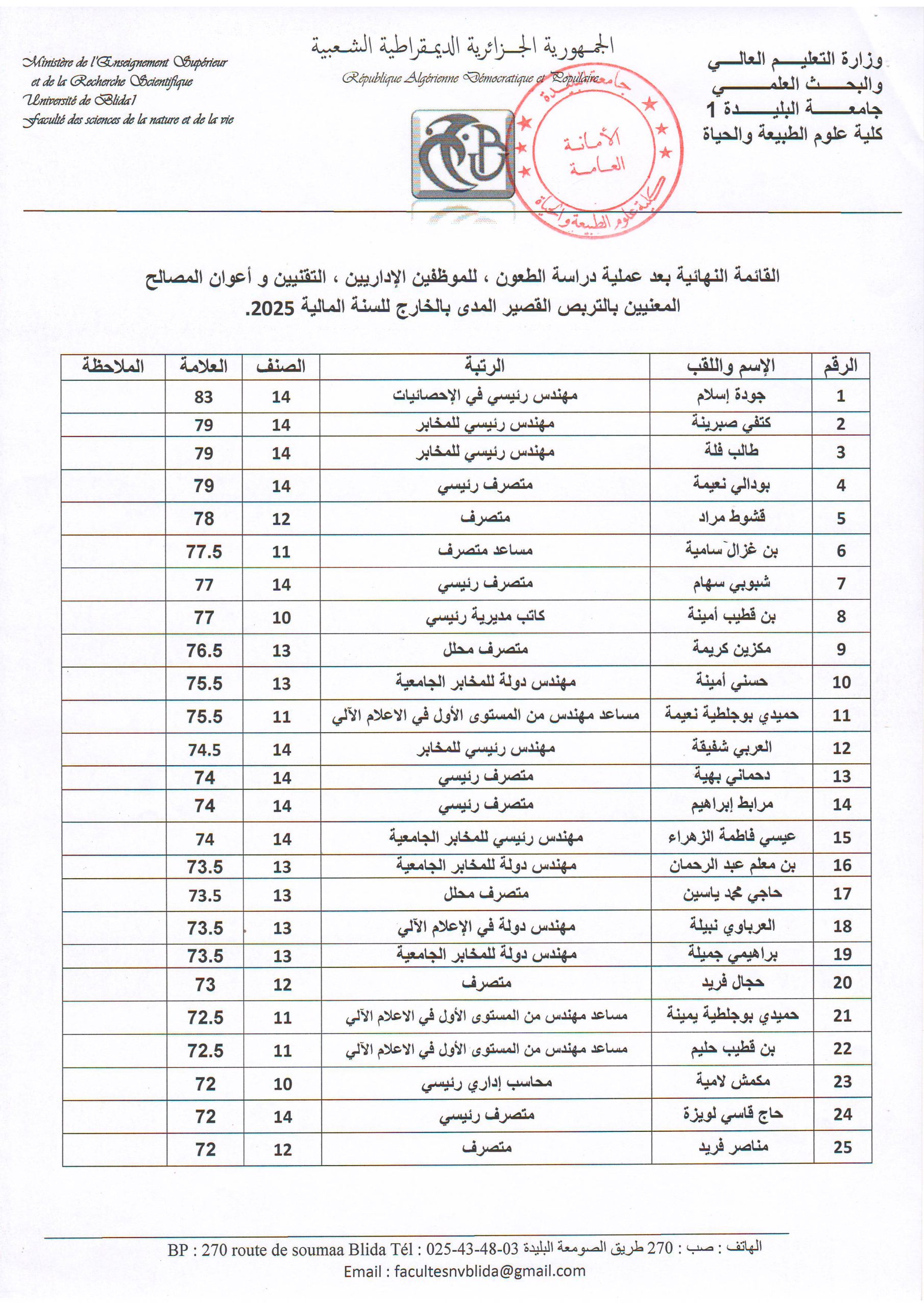 Liste Finale du personnels retenues pour un stage cours durée à l’étranger 2025