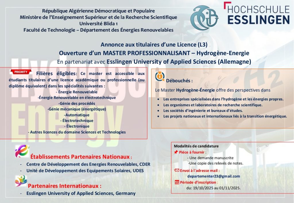 Ouverture d’un MASTER PROFESSIONNALISANT – Hydrogène-Energie En partenariat avec Esslingen University of Applied Sciences (Allemagne)